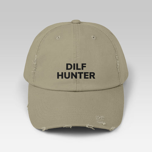 The DILF Hunter Hat | Distressed Khaki Cap with Bold Minimalist Statement Graphic